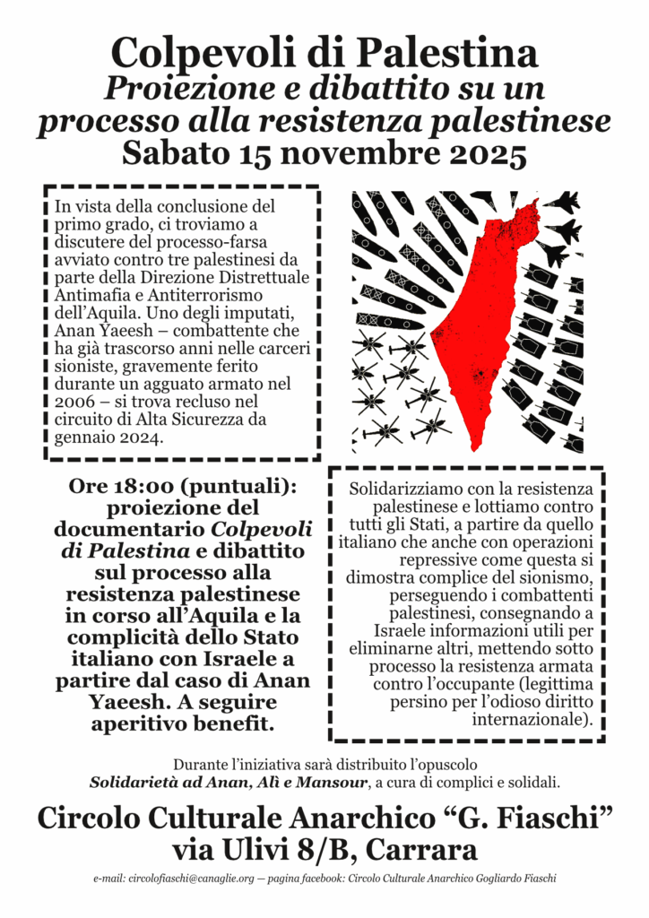 Ore 18:00: a partire dall’opuscolo Solidarietà ad Anan, Alì e Mansour a cura di complici e solidali, dibattito sul processo alla resistenza palestinese in corso all’Aquila e sulle complicità dello Stato italiano con Israele. A seguire aperitivo benefit.