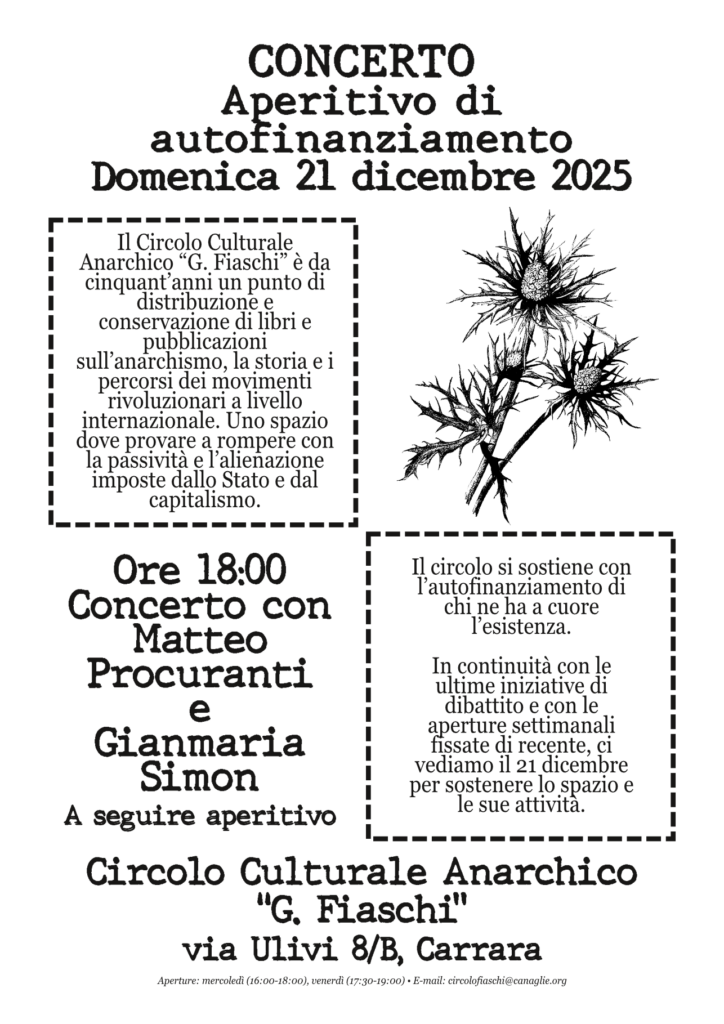 “Cose vecchie, dell’altro secolo?” (volantino) + Concerto e aperitivo di autofinanziamento (Carrara, 21 dicembre 2025) + Aperture del Circolo Culturale Anarchico “G. Fiaschi”
