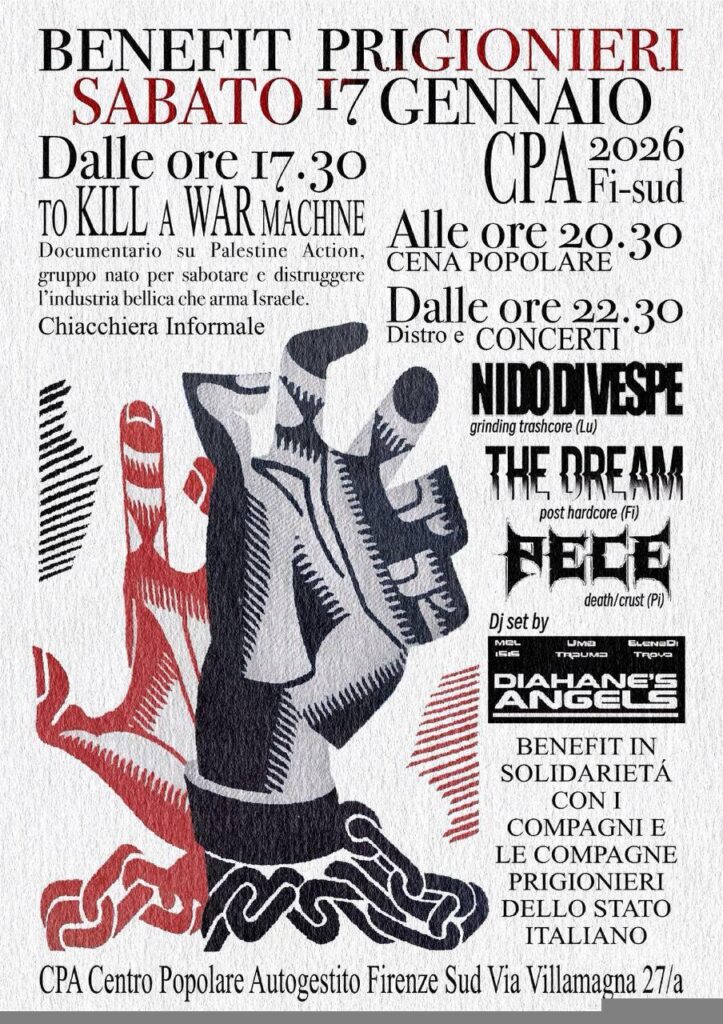 [Ricevuto via e-mail e pubblicato in https://lanemesi.noblogs.org/post/2026/01/07/serata-benefit-prigionieri-firenze-17-gennaio-2026/ | Pubblicato anche in https://www.cpafisud.org/agenda/serata-benefit-per-i-prigionieri-dello-stato/]