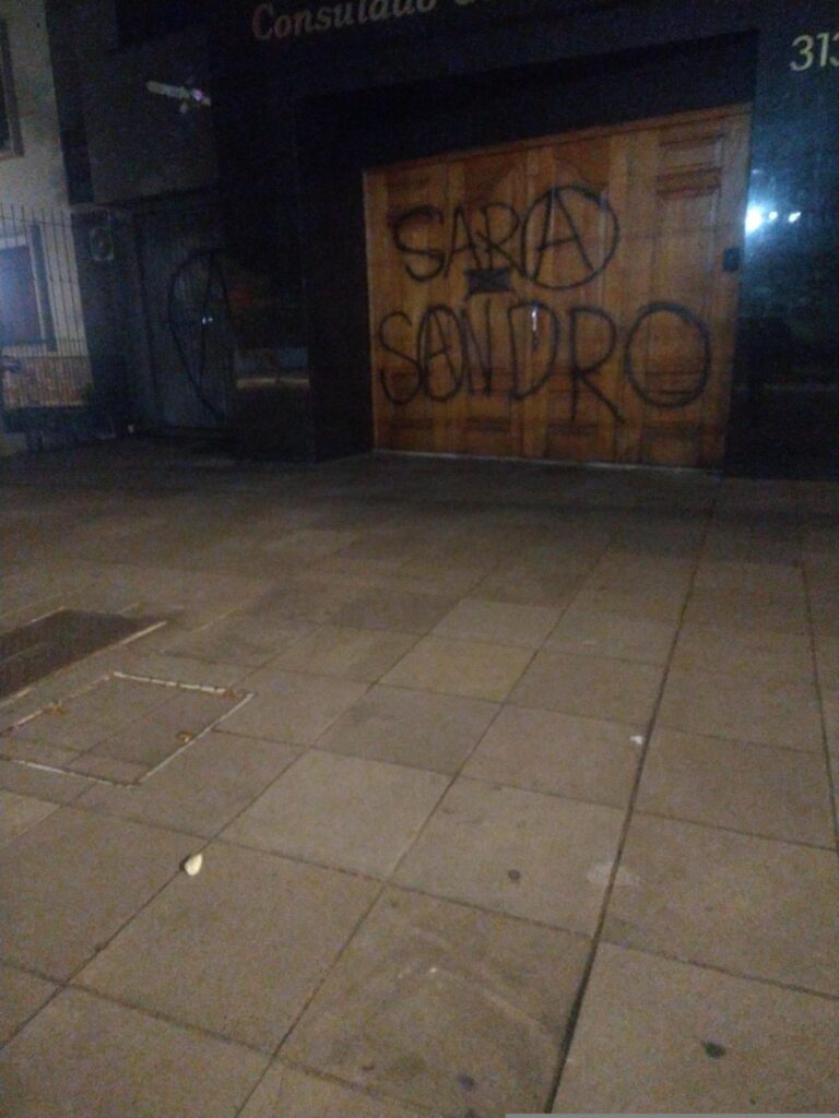 Nella notte di domenica 5 aprile abbiamo lasciato due parole e una lettera, ben impresse sulle porte del consolato italiano di Porto Alegre, territorio in conflitto con lo Stato brasiliano: Sara e Sandro!
