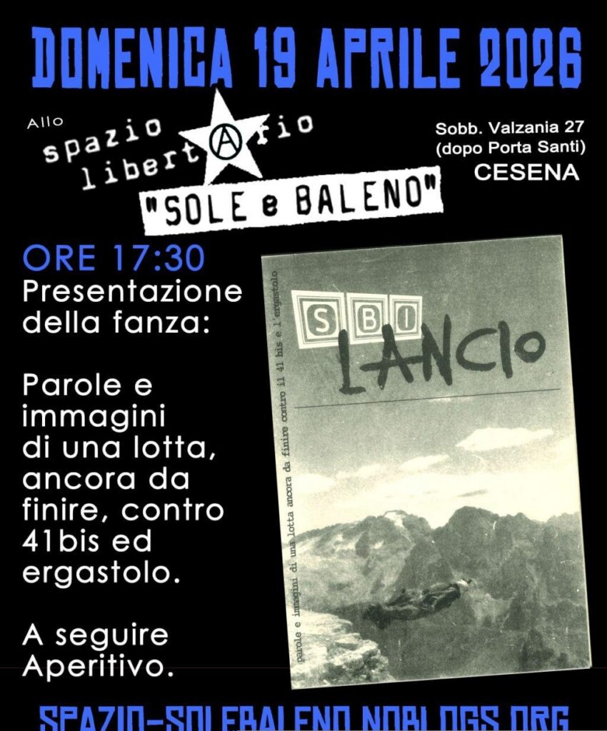 Presentazione della fanzine “Sbilancio”, parole e immagini della lotta ancora da finire contro il 41 bis e l’ergastolo presso lo Spazio Libertario “Sole e Baleno” (Cesena, 19 aprile 2026)
